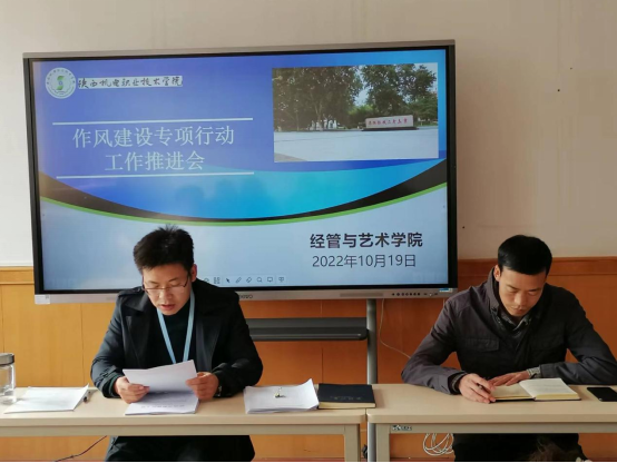 2022年10月19日下午经管与艺术公司党支部在建筑经管楼二楼会议室召开作风建设专项行动工作推进会,支部全体党员参加,会议由经理、党支部副书记杜海军主持。