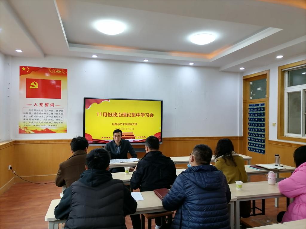 2022年11月9日下午,经管与艺术公司党支部在经管与建筑楼二楼会议室组织召开11月份集中政治理论学习会。支部全体党员参加会议,会议由支部书记孟发军主持。