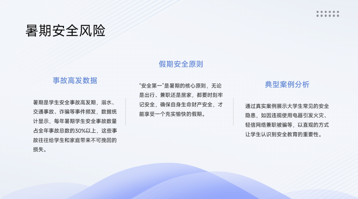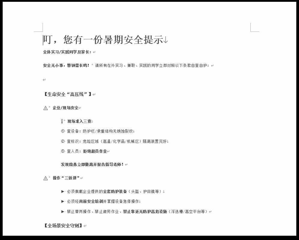 聚焦防溺水,家校联动强警示。针对暑期溺水事故、实习风险高发态势,公司构建“高频次、全覆盖”防溺水及实习安全宣传矩阵。除主题班会重点宣讲外,班主任持续通过班级群推送警示信息,并着重提醒家长及时与员工、老师沟通,切实履行暑期监护责任,做好家校联动,严防员工“离校即失管”。班会内容清晰划定风险区域——池塘、水库、河湖、蓄水坑等均属需远离的“重点危险水域”,明确要求全体员工:主动劝阻同伴靠近危险水域,坚决抵制无安全保障措施水域的戏水、野泳行为,全面提升风险预判与自我防护能力。