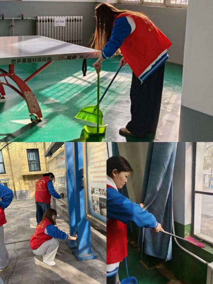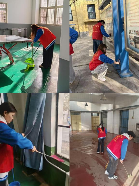 各小组分工协作、默契配合,细致清理各区域卫生死角:校门口清理垃圾、擦拭设施,焕新校园“门面”;机房清洁地面桌面、整理电脑周边,优化实训环境;乒乓球馆、羽毛球馆清理垃圾、擦拭球台门窗,保障运动环境;开水房清理水渍垃圾、擦拭台面龙头,保持整洁便捷。操场区域,志愿者弯腰捡拾各类垃圾、清理草坪杂物;一教、二教及学管楼宣传栏,擦拭清洁、清除污渍,传递正能量;电子信息大楼重点清洁宣传栏、玻璃门及窗台,改善楼宇环境。